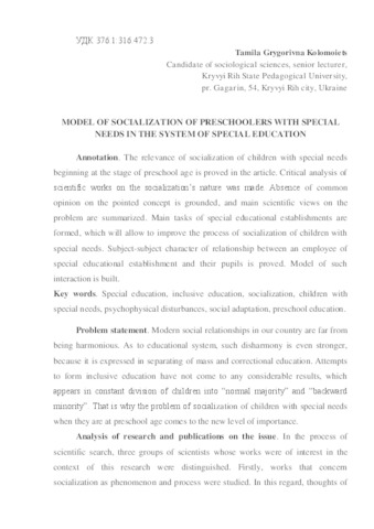 - Kolomoiets, Tamila (orcid.org/0000-0002-7321-0901) (2017) Model of socialization of preschoolers with special needs in the system of special education Science and education, 2. pp. 46-53. ISSN 2311-8466