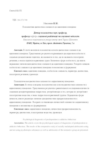 - Максимова, Н.Ю. (2017) Psychological diagnostics of predisposition to addictive behaviour Врачебное дело, 7 (1144). pp. 162-168. ISSN 1019-5297