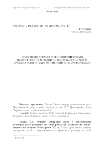 - Єжова, Т.Є. (2016) Educational integration of children with special educational needs as a way to realize their right to education: pedagogic researches in 20-30th years of the 20th century Актуальні питання корекційної освіти (педагогічні науки), 1 (7). pp. 108-121. ISSN 2413-2578