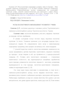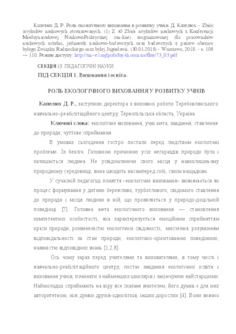 - Капелюх, Д.Р. (2018) Еnvironmental education in the development of students Monografia pokonferencyjna. Science, Research, Development Pedagogy. pp. 108-109. ISSN ISBN 978-83-66030-03-9