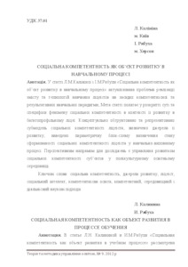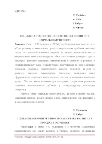 - Калініна, Л.М. and Рябуха, І.М. (2012) Social competence as object of development in an educational process "Теорія та методика управління освітою" (9). ISSN 2310-2411
