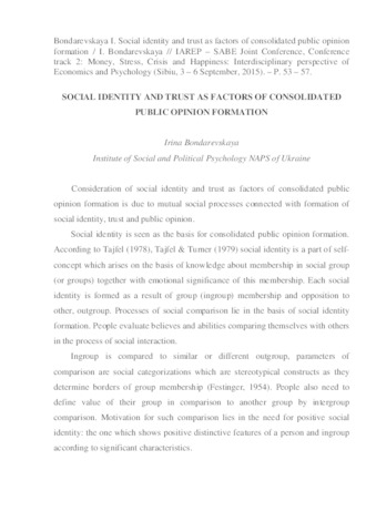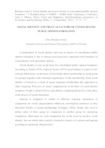 - Bondarevskaya, Irina (orcid.org/0000-0002-7006-0979) (2015) Social identity and trust as factors of consolidated public opinion formation In: Psychology and Economics together for a better life Book of Abstracts, Conference Track: Money, Stress, Crisis and Happiness , 2 . Lucian Blaga University of Sibiu, c.Sibiu, Romania, pp. 53-57. ISBN 978-606-12-1072-5
