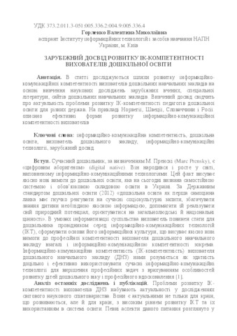 - Горленко, В.М. (2016) Foreign experience the development of information-communication competence of tutors of preschool educational institutions Науковий вісник Ужгородського університету. Серія: "Педагогіка. Соціальна робота", 2 (39). pp. 62-67. ISSN 2524-0609