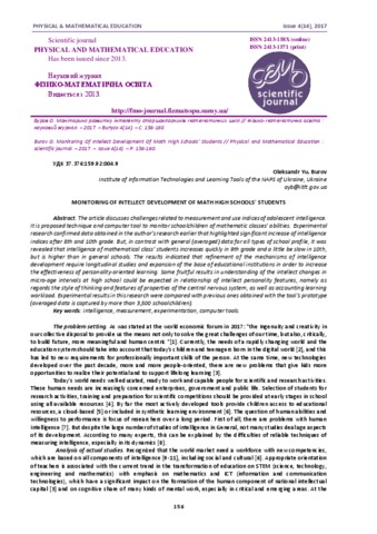 - Burov, O. Yu. (orcid.org/0000-0003-0733-1120) (2017) Monitoring of intellect development of math high schools’ students Фізико-математична освіта, 4 (14). pp. 156-160. ISSN 2413-1571