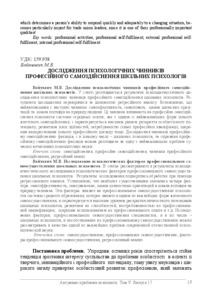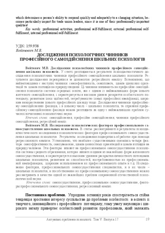 - Войтович, Марія Володимирівна (2017) The psychological factors of professional self-fulfillment of school psychologists Актуальні проблеми психології: Том. V: Психофізіологія. Психологія праці. Експериментальна психологія, 17. pp. 19-30. ISSN 2072-4772