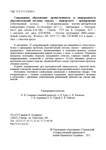 - Єжова, Т.Є. (2017) Some aspects of conducting career-oriented career guidance for students with future educational needs among adolescents with special educational needs In: Современное образование: преемственность и непрерывность образовательной системы «школа – университет – предприятие»: ХІ международная научно-методическая конференция (Гомель, 23–24 ноября 2017 г.) . ГГУ им. Ф. Скорины, м. Гомель, Білорусь, pp. 219-223.