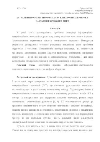 - Горленко, В.М. (orcid.org/0000-0003-3963-4804) (2015) Аctual problems of using of electronic toys in children training and education Проблеми освіти, 2 (83). pp. 88-93.