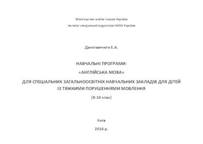 - Данілавічютє, Е.А. (orcid.org/0000-0003-3911-7612) (2016) The educational programs: "English language" for special secondary schools for children with severe speech disorders (8-10 grade) [Teaching Resource]