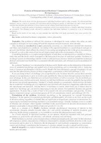 - Chykhantsova, O. (orcid.org/0000-0002-2661-3265) (2018) Features of Demonstration of Hardiness’ Components of Personality Science and education a new dimension. Pedagogy and psychology, 6(65) (155). pp. 58-60. ISSN 2308-5258