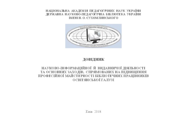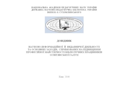 Handbook for scientific information and publishing activities and main events aimed at improving professional skills of librarians in the sphere of education was prepared in 2018 by the Department for providing scientific and methodical support to education libraries, V.O. Sukhomlynskyi State Scientific and Pedagogical Library of Ukraine, within the framework of the research titled ‘Methodological principles of development of education libraries as an important component of educational environment’. The main aim of the Handbook is to generalise and spread information on information and publishing activities carried out by the system of leading education libraries under the Ministry of Education and Science of Ukraine and the National Academy of Educational Sciences of Ukraine. Topics include development of scientific publications; making indices and workbooks; scientific and practical events aimed at improving the professional level of librarians in the sphere of education. The Handbook is aimed at librarians, methodologists of education and science departments of regional and city state administrations, and other specialists involved in providing information support to pedagogical science and practice.