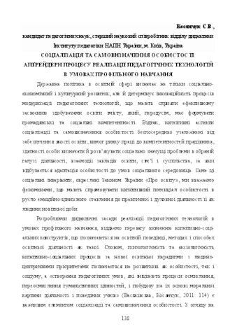 - Косянчук, Сергій Володимирович (2018) The socialization and self-determination of personality: the factors of upgrades of the process of realization pedagogical technologies in the profile education Психологія свідомості: теорія і практика наукових досліджень. Матеріали IІ міжнародної науково-практичної конференції (21 берез. 2018 р., м. Переяслав-Хмельницький). pp. 138-141.