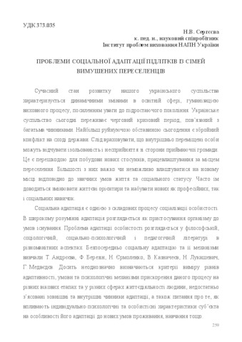 - Сергєєва, Н.В. (orcid.org/0000-0001-8153-2911) (2018) Problems of social adaptation of adolescents from families of internally displaced persons In: Проектний підхід та інновації в освіті в контексті інтеграції до європейського освітнього простору: збірник матеріалів Міжнародної науково-практичної конференції, м. Лодзь, 21 березня 2018 р. . Університет Суспільних Наук, м. Лодзь, Польща, pp. 259-261. ISBN 978-83-64838-22-4