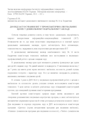 - Горленко, В.М. (orcid.org/0000-0003-3963-4804) (2013) Experience of ICT application in profilactic-treatment achievements in preschool educational institution In: Матеріали Звітної наукової конференції Інституту інформаційних технологій і засобів навчання НАПН України . ІІТЗН НАПН України, м.Київ, Україна, pp. 132-133.