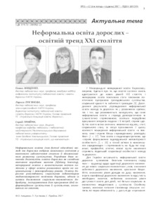- Аніщенко, Олена Валеріївна (orcid.org/0000-0002-6145-2321), Лук’янова, Лариса Борисівна (orcid.org/0000-0002-0982-6162) and Прийма, Сергій Миколайович (orcid.org/0000-0002-2654-5610) (2017) Non-formal education of adults – educational trends of the xxi century Рідна школа, 11-12. pp. 3-7. ISSN 0131-6788