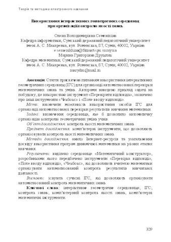 - Семеніхіна, О.В. and Друшляк, М.Г. (2015) Using of interactive geometrical environments for organization control of quality of students’ knowledge Theory and methods of learning mathematics, physics, informatics, 2(36) (13). pp. 329-334. ISSN 2309-1479
