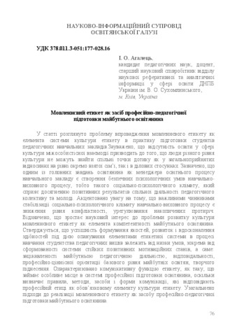 - Агалець, Інна Олександрівна (orcid.org/0000-0002-5071-9019) (2018) Speech etiquette as the future teacher professional and pedagogical training means Науково-педагогічні студії, 1. pp. 76-86.