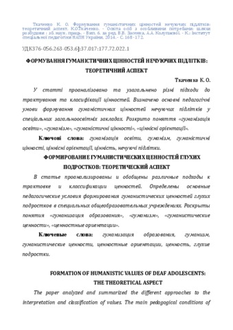 - Ткаченко, К.О. (2014) Formation of humanistic values of deaf adolescents: the theoretical aspect Освіта осіб з особливими потребами: шляхи розбудови, 6. pp. 168-172. ISSN 2313-4011