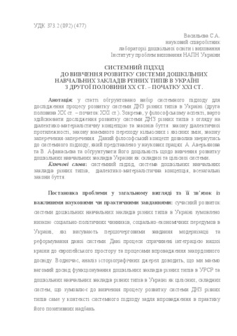 - Васильєва, С.А. (orcid.org/0000-0002-0452-4835) (2016) Systems approach to study the development of system of pre-school educational establishments of various types in Ukraine since the second half of the twentieth ХХ v. - beginning of ХХІ century Педагогічний альманах, 32. pp. 251-258.