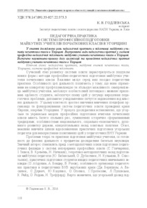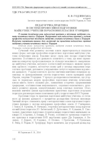 - Годлевська, К.В. (2016) Educational Practice in the System of Professional Training of Primary School Teachers in Hungary Педагогіка формування творчої особистості у вищій і загальноосвітній школах, 51 (104). pp. 118-122. ISSN 1992-5786