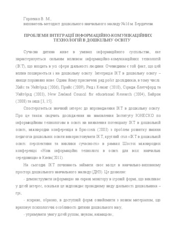 - Горленко, В.М. (2012) Problems of integration of information and communication technologies in preschool education In: Звітна наукова конференція Інституту інформаційних технологій і засобів навчання НАПН України . ІІТЗН НАПН України, м. Київ, Україна, pp. 89-91.