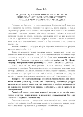 - Ларіна, Тетяна Олексіївна (orcid.org/0000-0001-8975-3348) (2017) Model of social and psychological resources of personality resiliehce in the structure of human psychological well-being In: Ракурси психологічного благополуччя особистості: збірник тез доповідей всеукраїнського науково-практичного семінару "Ракурси психологічного благополуччя особистості", 9 червня 2017 р., Ніжин . НДУ ім. М.Гоголя, м. Ніжин, Україна, pp. 86-91.