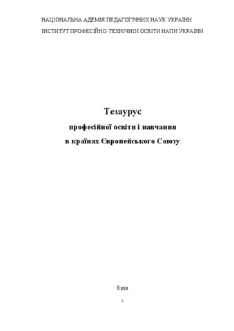 Thesaurus contains basic terms in the field of vocational education and training, which are used in the European educational and scientific environment at the beginning of the XXI century. The publication includes key terms Which are necessary for the comparative study of national systems of vocational education and training in the conditions of European integration. In their interpretation, the authors focus on the European discourse on the formation and implementation of common principles and guidelines of education in accordance with the aims, values and objectives of lifelong learning. Sampling was carried out taking into account the terms of sources of resources of the European Center of Vocational Education and Training. For policy makers, researchers, heads of educational institutions, employers, teachers, students of vocational schools.