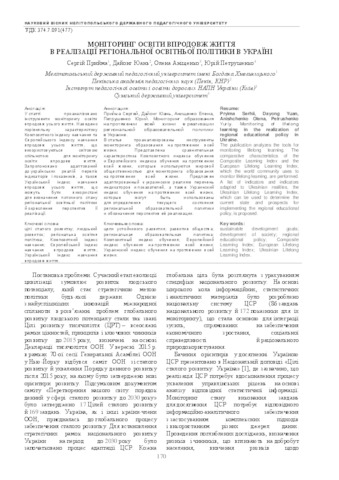 - Прийма, Сергій Миколайович (orcid.org/0000-0002-2654-5610), Дайонг, Юань, Аніщенко, Олена Валеріївна (orcid.org/0000-0002-6145-2321) and Петрушенко, Ю.М. (2017) Monitoring of lifelong learning in the realization of regional educational policy in Ukraine Науковий вісник Мелітопольського державного педагогічного університету. Серія: Педагогіка, 2 (19). pp. 170-177. ISSN 2219-5203