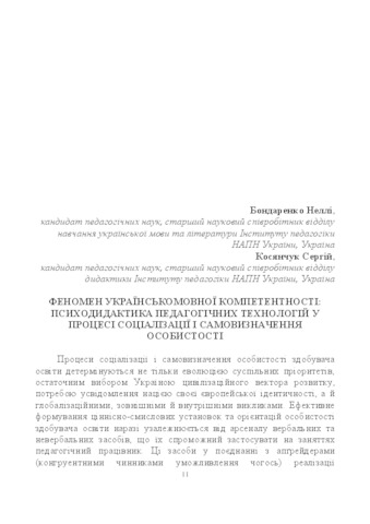 - Бондаренко, Неллі Володимирівна (orcid.org/0000-0002-4033-7287) and Косянчук, Сергій Володимирович (orcid.org/0000-0003-1334-6011) (2018) The phenomenon of Ukrainian language competence: psychodidactics of pedagogical technologies in the process socialization and self-determination of personality «Folia comeniana» : Вісник Польсько-української науково-дослідницької лабораторії психодидактики імені Я. А. Коменського, 1. pp. 11-16.