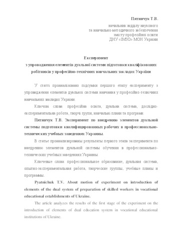 - Пятничук, Т.В. (2017) About motion of experiment on introduction of elements of the dual system of preparation of skilled workers in vocational educational establishments of Ukraine. Вища школа, 5-6 (155). pp. 78-84. ISSN 1682-2366
