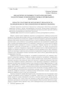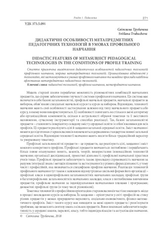 - Трубачева, Світлана Едуардівна (2018) Didactic features of meta-subject pedagogical technologies in conditions of profile training Педагогічна освіта: теорія і практика, 1/24 (1). pp. 271-277. ISSN 2309-9763