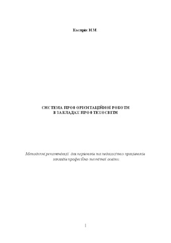 The methodical manual addresses the issues of vocational guidance work in vocational education institutions. The publication is intended for practical psychologists, social pedagogues, teachers, masters of industrial training of vocational education establishments, which directly work with the student youth.