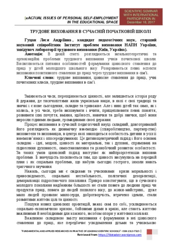 - Гуцан, Л.А. (orcid.org/0000-0003-1588-0162) (2017) Labor education in modern schools In: Round Table Talk «Actual issues of personal self-employment in the educational space» December 18, 2017 . Fundamental And Applied Researches In Practice Of Leading Scientific Schools, м. Київ, Україна. ISBN ISSN 2313-7525