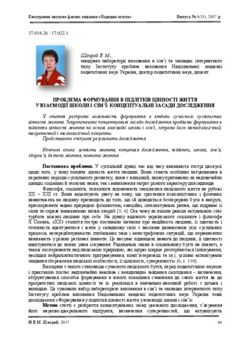 - Шахрай, В.М. (2017) The Problem of the Formation of the Value of Life in Adolescents in the Interaction of School and Family: the Conceptual Basis of the Study Народна освіта, 3 (33). pp. 64-70. ISSN 966-8358-22-8