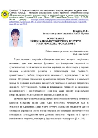- Кульбіда, С.В. (orcid.org/0000-0002-0194-3495) (2018) Formation of national-patriotic feelings in deaf at the language lessons Матеріали Всеукраїнської науково-практичної інтернет-конференції «Національно-патріотичне виховання дітей та учнівської молоді в умовах модернізаційних суспільних змін», 15 травня 2018 року, м. Умань. pp. 25-29.