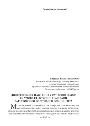 - Кизенко, Василь Іванович (2018) Differentiation of training in modern school as a condition for effective realization of a variative educational component In: Диференціація у шкільній освіті: історичний досвід і сучасні технології : збірник матеріалів Всеукраїнської науково-практичної конференції, 16 трав. 2018 р., м. Київ . Інститут педагогіки, м. Київ, Україна, pp. 155-159.