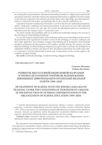 - Шевченко, Світлана Миколаївна (2018) Development of schools with the Jewish language of instruction in the conditions of independent Ukraine as a reflection of external differentiation in the organization of school education (1991-2010) Pedagogical education: theory and practice, 1 (24/1). pp. 287-294. ISSN 2309-9763