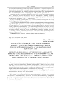 The article is dedicated to the problem of educational process organization in schools with the Jewish language of instructionin their mother-tongue under differentiation of general secondary school education in independent Ukraine (1991–2010). It shows the development of the network of schools with the teaching of the Jewish language on the territory of Ukraine. There was set that the educational system of Jewish groups has found its rebirth in an investigated period. It was found out that during realization of governmental politics ethnic groups education has declared the balance of knowledge and skills, free development of national languages and cultures and supporting Jewish groups needs of educational and methodical literature in ethnic languages which paid attention to certain historical events version for other ethnic groups representatives in Ukraine. It was des covered, that foundation and development of ethnic schools in a greed measure is related to national politics that assists their further development and functioning; so, the state assures all ethnic groups right to national and cultural autonomy, in partly the use and education in mother tongue or study of the mother tongue in state educational establishments, the creation of national cultural establishments. There were the changes of curricula for schools with Jewish languages of education highlighted and there were elective and optional courses implementation emphasized. The acted at schools of ethnic groups and at cultural societies, where the mother tongue of ethnic groups was studied; a transition from the optional study of the mother tongue to the introduction of it as educational subject and the creation of corresponding classes and schools is traced. It was set that under independent Ukraine (1991–2010) a government created the best facilities for mother tongue education in schools of ethnic groups, and also it was investigated, that ethnic groups which lived on territory of Ukraine in order of having cultural and common differences, and forms of mentality diversity in their correlation acquire the system unity transforming into a certain organizational cohesion.