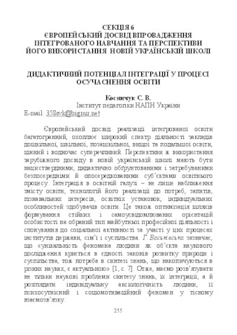 - Косянчук, Сергій Володимирович (2018) Didactic potential of integration in the process of modernization of education In: Нова українська школа: теорія і практика інтегрованого підходу , 1 . Вектор, м.Тернопіль, Україна, pp. 255-259.