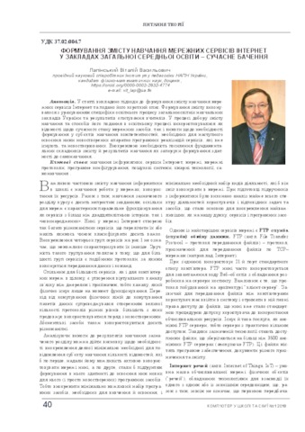 - Лапінський, В.В. (orcid.org/0000-0002-2832-4774) (2018) Formation of the content of education Internet services for teaching computer science in secondary school Комп'ютер у школі та сім'ї, 1 (145). pp. 40-46. ISSN 2307-9851