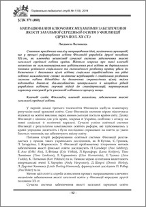 Статтю присвячено аналізу напрацювання ідей, політичних принципів, що у процесі реформування освіти Фінляндії упродовж другої половини ХХ ст., як ключових механізмів сучасної системи забезпечення якості загальної середньої освіти країни. Йдеться зокрема про такі ключові механізми як загальнонаціональне усвідомлення ролі освіти як вирішального чинника успішного соціального та економічного розвитку країни; увага до визначення і виконання цілей освіти; соціальна справедливість та рівні освітні можливостей; стійке політичне керівництво і стабільний розвиток системи освіти відповідно до визначених стратегічних цілей; якісна підготовка вчителя; збалансованість центрального й місцевого рівнів управління освітою; гнучкий підхід до стандартизації; партнерський характер стосунків усіх учасників освітнього процесу тощо.