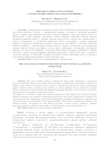 The issue of future teachers’ preparing for using cloud technologies in educational process, in particular when a class teacher’s duties are made, is relevant and is determined on the basis of analysis in this research. The purpose of the research is to present the experience of some methodological aspects of future teachers’ education (class teachers) to working methods with the cloud service Google Forms, in particular, its use in working with parents and students. The object of the research is the process of future teachers’ preparing for professional activity. The subject of the study is future class teachers’ preparation using Google Forms. General scientific methods of research, this is analysis, comparison, generalization were used in the process of research. The research showed that pedagogically balanced and methodically grounded combination of traditional and cloud technologies in class teacher’s work would contribute the formation of students' personalities, their scientific outlook, development of their abilities and skills. It would involve parents in students' upbringing and doing common creative affairs, it would establish contact between them, etc.