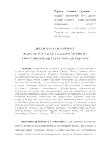 - Скрипник, М.І. (2018) Childhood in times of change: how not to be afraid to engage the concept of childhood in the programs of professional development of teachers Методист, 6. pp. 24-33.