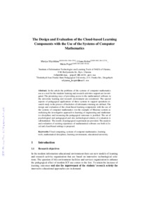 - Shyshkina, M.P. (orcid.org/0000-0001-5569-2700), Kohut, U.P (orcid.org/0000-0002-2861-2274) and Popel, M.V. (orcid.org/0000-0002-8087-962X) (2018) The Design and Evaluation of the Cloud-based Learning Components with the Use of the Systems of Computer Mathematics Proceedings of the 14th International Conference on ICT in Education, Research and Industrial Applications. Integration, Harmonization and Knowledge Transfer. Volume II: Workshops (2104). pp. 305-317. ISSN 1613-0073