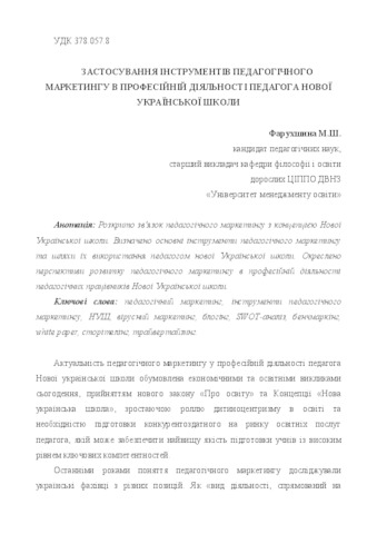 - Фарухшина, Марина Шаміліївна (2018) Application of pedagogical marketing tools in the professional activity of a teacher of a New Ukrainian school Методист, 6. pp. 37-41.