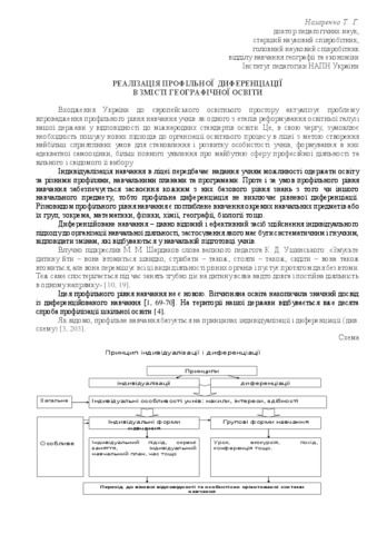 - Назаренко, Тетяна Геннадіївна (2018) Implementation of profile differentiation in the content of geographic education Диференціація у шкільній освіті: історичний досвід і сучасні технології : збірник матеріалів Всеукраїнської науково-практичної конференції, 16 трав. 2018 р., м. Київ. pp. 177-182.