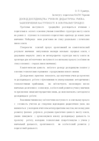 - Кравчук, Ольга Павлівна (2018) The experience of student research as a didactic condition for ensuring the continuity of the educational process. In: Міжнародна науково-практична конференція "Нова українська школа: теорія і практика реалізації інтегрованого підходу" . Тернопільський національний педагогічний університет ім. Володимира Гнатюка, м. Тернопіль, Україна, pp. 98-99.