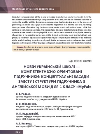 - Редько, Валерій Григорович, Козлова, Альона Ігорівна, Ніколаєнко, В. В. and Кодалашвілі, О. Б. (2018) For the new Ukrainian school — competency oriented textbooks: conceptual basics of the content and structure of the English language textbooks for the 1st grade «MyPal» Проблеми сучасного підручника (20). pp. 372-385. ISSN 2411-1309