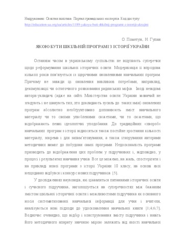 - Пометун, Олена Іванівна and Гупан, Нестор Миколайович (2018) What should be a school curriculum on the history of Ukraine Освітня політика. Портал громадських експертів.