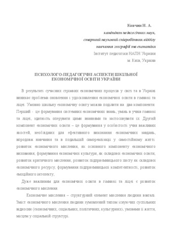 - Ковчин, Наталія Андріївна (orcid.org/0000-0003-0432-3643) (2018) Рsychological and pedagogical aspects of school economic education In: Збірник тез наукових робіт учасників міжнародної нуково-практичної конференції "Психологія та педагогіка: необхідність впливу науки на розвитоак України" , 1 . Львівська педагогічна спільнота, м. Львів, Україна, pp. 48-51.