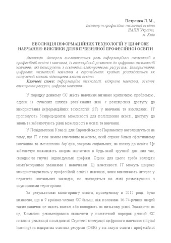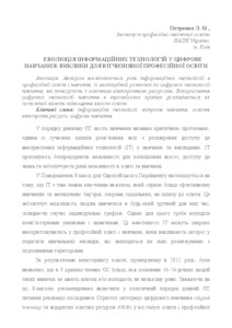 - Петренко, Лариса Михайлівна (orcid.org/0000-0002-7604-7273) (2018) Evolution of Information Technologies in Digital Learning: Challenges for Native Vocational Education In: Підготовка конкурентоздатних фахівців: виклики сучасності: зб. матеріалів Всеукр. наук.-практ. конф., 25-26 квітня 2018 р. , 1 . КПГТЛ, м. Кривий Ріг, Україна, pp. 168-171.